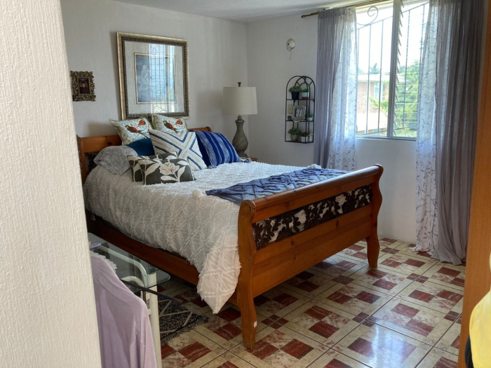 Gradas con pásamanos, amplia sala familiar, balcón, 3 habitaciones, la principal con bańo privado y closet, dos habitaciones secundarias con bańo completo compartido, closet.